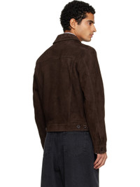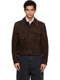 Goatskin suede jacket. · Spread collar · Button closure · Flap pockets at chest · Buttoned barrel cuffs · Adjustable button tabs at back hem · Welt pocket at interior · Full satin lining Supplier color: Dark brown Body: 100% goatskin. Lining: 50% viscose, 50% polyester. Made in South Korea 252251M181004