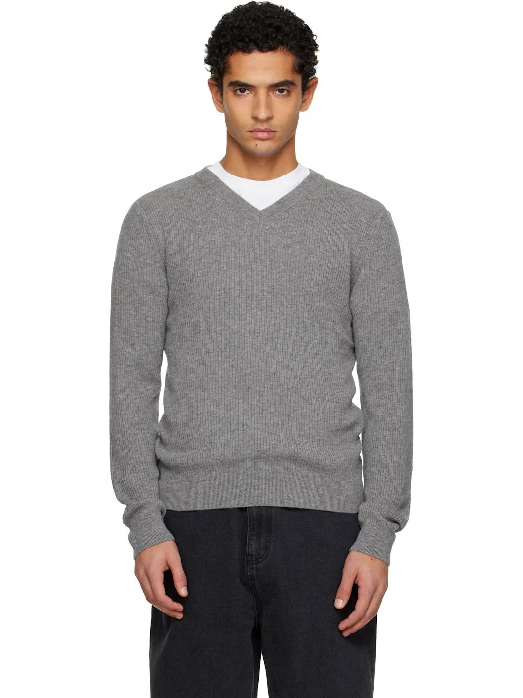 Gray Ribbed V-Neck Sweater