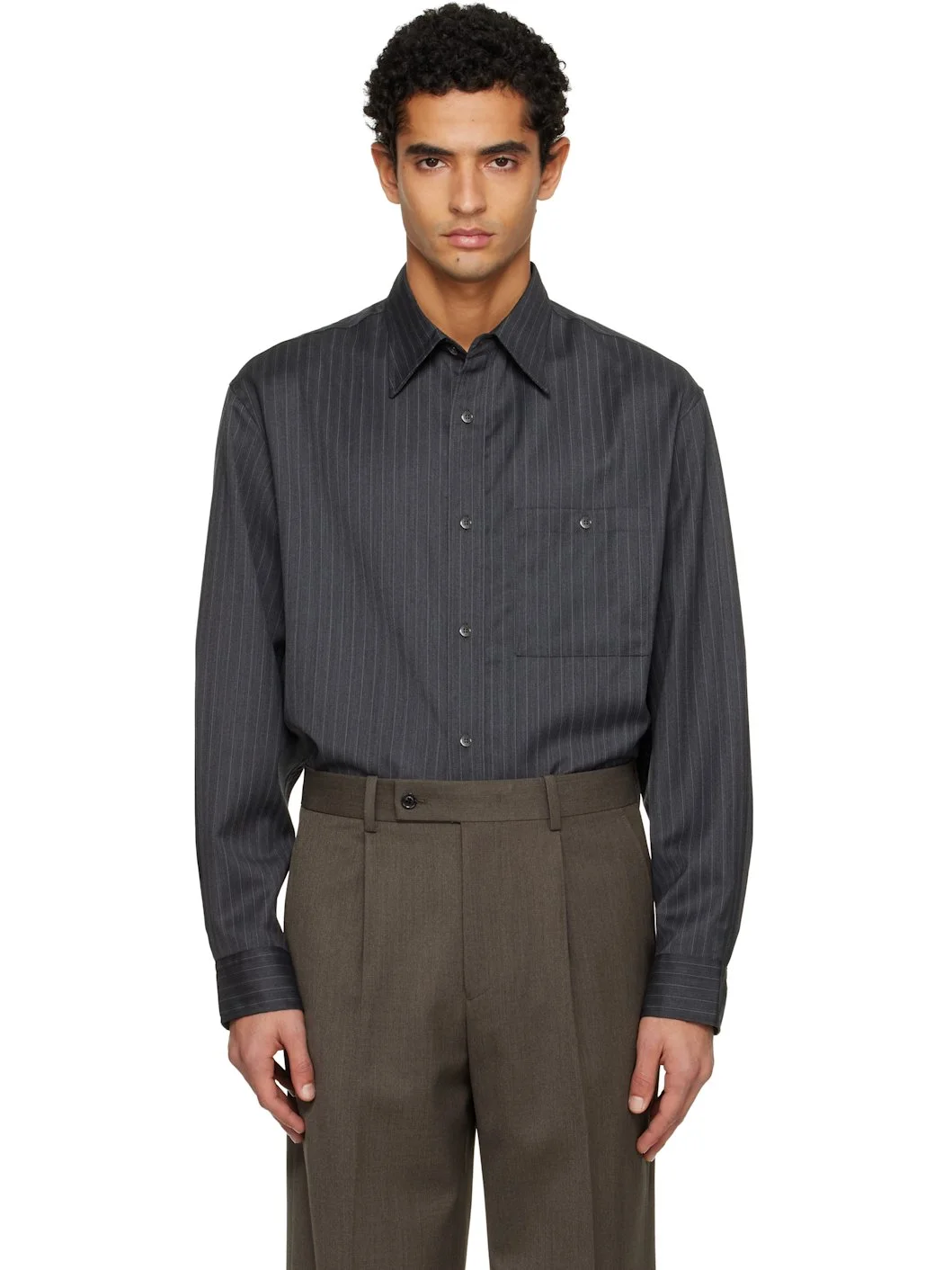 Wool-blend twill shirt. · Pinstripes throughout · Spread collar · Button closure · Shirttail hem · Pleats at buttoned barrel cuffs · Box pleat at back yoke Supplier color: Grey pinstripe 50% wool, 50% polyester. Made in South Korea 252251M192010