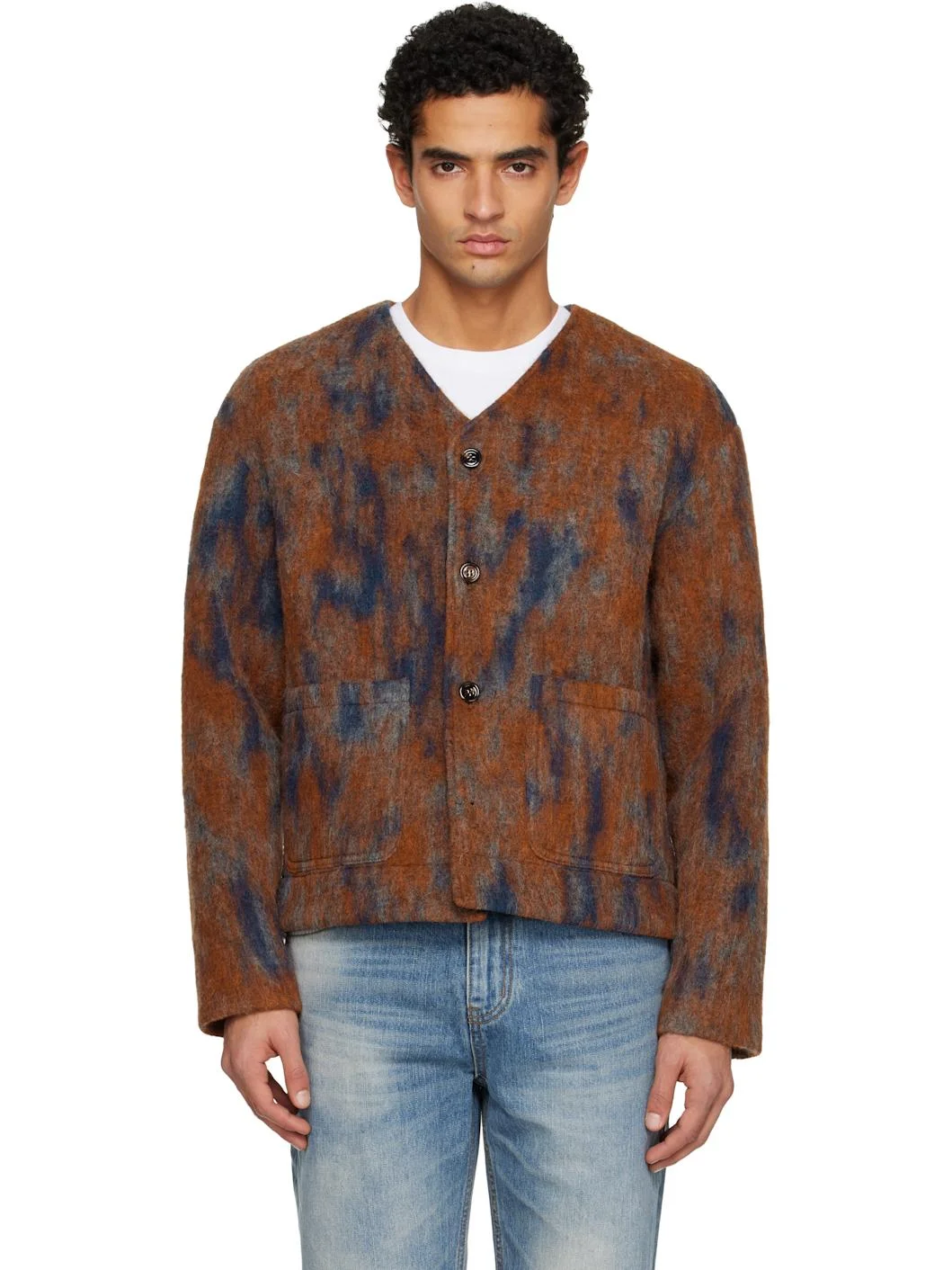 Brushed knit wool-blend cardigan. · V-neck · Button closure · Patch pockets at front · Partial satin lining Supplier color: Rust orange Body: 68% wool, 32% polyester. Lining 1: 55% wool, 35% rayon, 10% polyester. Lining 2: 50% viscose, 50% polyester. Made in South Korea 252251M206000