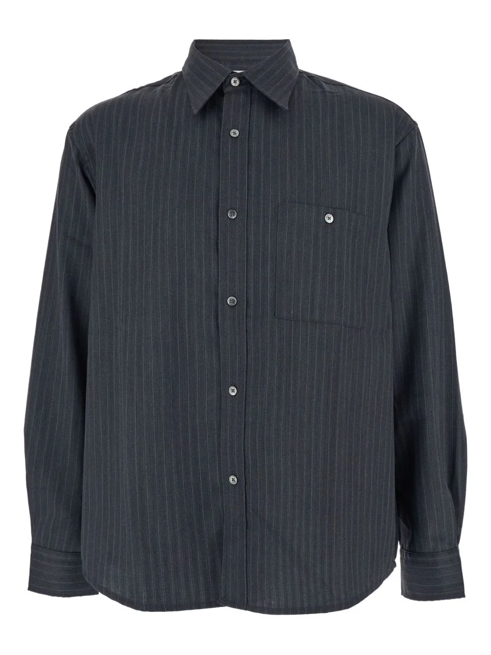 pinstripe-pattern pointed-collar shirt Highlights - Grey - Pinstripe pattern - Pointed collar - Front button closure - Chest pocket - Buttoned cuffs Imported Composition Wool 50%, Polyester 50% Washing instructions Read Manufacturer Guidelines