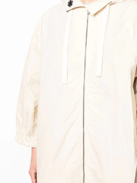 hooded drawstring cotton coat chalk white cotton drawstring hood drawstring hem front zip fastening three-quarter length sleeves straight hem thigh-length Imported Composition Cotton 100% SIZE & FIT Model measurements Height 6 ft 2 in(1.87 m) Bust/Chest 34.25 in(87 cm) Hips 36.22 in(92 cm) Waist 29.52 in(75 cm) FittingInformation This piece fits true to size. We recommend you get your regular size Cut for a loose fit Made with a mid-weight non-stretch fabric Washing instructions Hand Wash