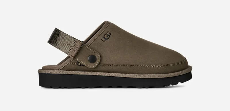 Your favorite Goldencoast Clog II is now ready for all of your elevated summer adventures with our new nubuck material. It features a cushy foam footbed and an adjustable back strap that can be slung over the front for even more wearing options. Slip into the lightweight comfort of renewable sugarcane EVA and a soft microfiber lining made from 100% recycled fibers.This product was made in a factory that supports women in our supply chain with the help of Reimagining Industry to Support Equality (RISE). This collaborative initiative creates partnerships with brands like ours to empower and educate women in the workplace. Protected: Waterproof or Water-Resistant Materials. Waterproof leather. Nubuck upper. Microfiber Binding, Metal hardware. Adjustable heel strap, Hook-and-loop closure. Textile lining made from 100% recycled polyester fibers. Microfiber sockliner. Foam footbed. Sugarcane EVA outsole. The UGG® Logo, heat-embossed. RN 88276. UGG® Men's Goldencoast Clog II Nubuck Shoes in Dried Oregano, Size 11