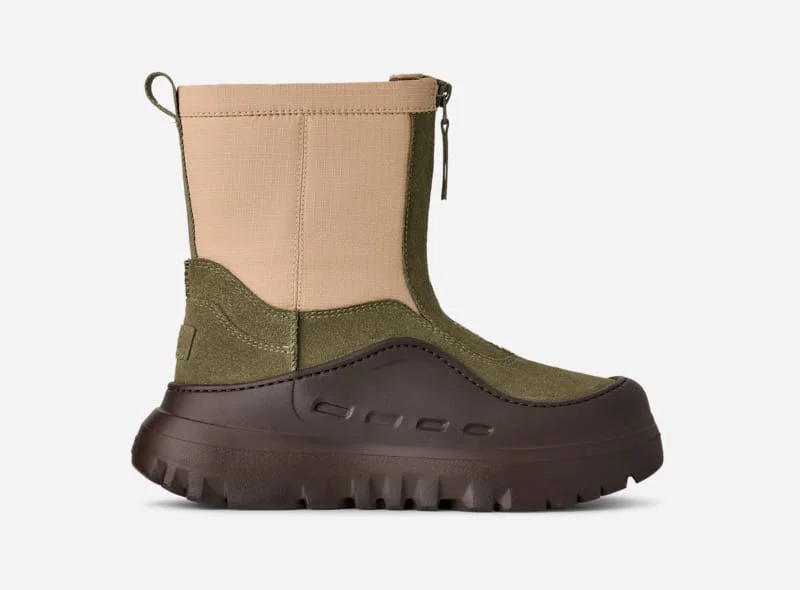 So you want bold style, a sculpted shape, and all-day comfort? That's a tall order that our Peak Mod Boot is ready to fill. Crafted with a combination of suede and recycled textiles and wrapped in a molded sugarcane EVA outsole, it delivers mega style, maximum comfort, and year-round versatility.This product was made in a factory that supports women in our supply chain with the help of Reimagining Industry to Support Equality (RISE). This collaborative initiative creates partnerships with brands like ours to empower and educate women in the workplace. Suede, Textile made with 100% recycled polyester fibers upper. Cuffable shaft, Pull tab, Shaft made form 100% recycled polyester fibers. Front shaft zipper. Recycled textile lining. Sockliner textile made with 100% recycled polyester. Poured PU footbed incorporates at least 50% bio-based content. Sugarcane EVA midsole. Sugarcane EVA outsole, Flocked outsole. The UGG® Logo, heat-embossed. RN 88276. UGG® Men's Peak Mod Boot Suede/Textile Boots in Burnt Olive/Mustard Seed, Size 12