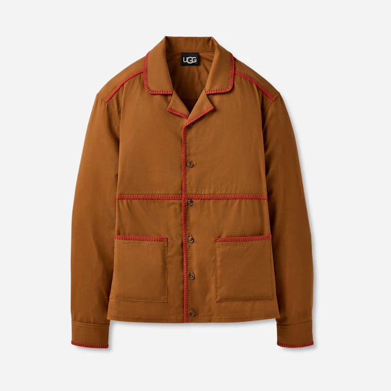 Sophisticated but casually cool, our Zakari Top goes double duty as both a shirt and a relaxed coat. It's up to you on how you style it. We added a whipstitch detail and front patch pockets to serve fashion and function at the same time. Wear with our matching Ryaan Pant for an effortless pairing.This product was made in a factory that supports women in our supply chain with the help of Reimagining Industry to Support Equality (RISE). This collaborative initiative creates partnerships with brands like ours to empower and educate women in the workplace. Relaxed-fit button-up long sleeve shirt. Self - 74% Responsible Cotton/26% LENZING ECOVERO Viscose. LENZING and ECOVERO are trademarks of Lenzing AG. Back Yoke Lining - 100% Responsible Cotton. Responsible Cotton means: responsible cotton sourcing scheme cotton, recycled cotton, or organic cotton. Collared neckline. The Graphic UGG® Logo button closures on center front placket and sleeve cuffs. Whipstitch detail along collar, center front, front chest seam, back seam, shoulder seams, and pocket and sleeve openings. Front patch pockets. Embroidered The UGG® License Plate. 28 inch HPS Length [Size M]. Pairs with Ryaan Pant. Imported. UGG® Men's Zakari Top in Brown Mustard, Size XL