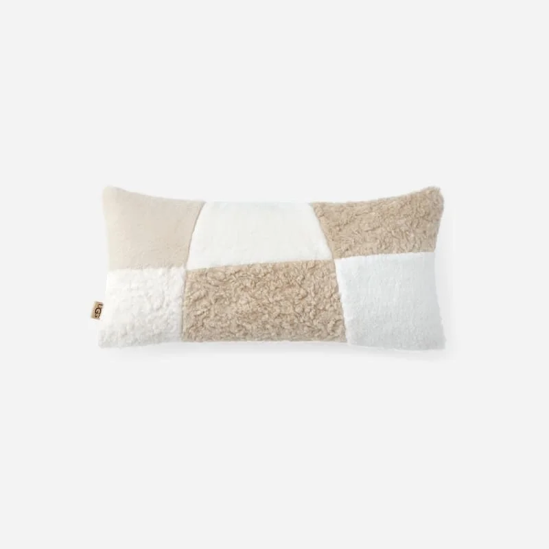 Playful in shape, plush in feel. Our Sibel Bolster pillow is composed of pieced fabric, and features a patchwork design. 100% polyester. 14x30 inch. The UGG® Logo faux leather label. Hang tag. UGG® Sibel Bolster 14 inch x 30 inch Pillows in Cream