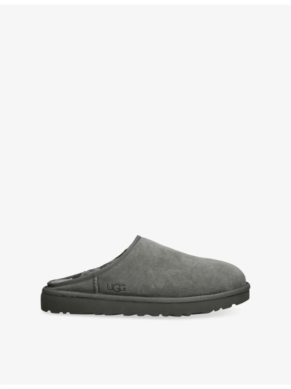 PRODUCT DETAILS - UGG suede slippers - 100% suede - Round closed toe, logo at side, sheepskin lining, tread sole, open back - Specialist leather clean - Upper: 100% suede - Lining: 100% sheepskin - Sole: 100% EVA Ref: R04509974