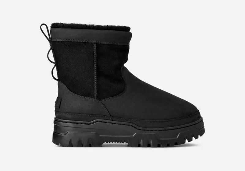 When you need to go the distance no matter the weather, get into our Heritage Pull-on Trail Gazer. These winter-ready boots are crafted with a waterproof, full-grain leather upper that's been seam sealed for added protection from the elements. Inside you'll find our soft UGG®plush blend and a genuine sheepskin collar lining designed to surround you in the rich Feel of UGG®. The outsole has White Spider Rubber for enhanced traction. Rated to keep you warm in temps as low as -20ºC.This product was made in a factory that supports women in our supply chain with the help of Reimagining Industry to Support Equality (RISE). This collaborative initiative creates partnerships with brands like ours to empower and educate women in the workplace. Waterproof Features. Seam-sealed construction. Waterproof leather. Full-grain leather, Oiled suede upper. Rear pull tab made from 100% recycled polyester fibers. 17mm UGG®plush 60% upcycled wool, 40% TENCEL Lyocell shaft lining, 17mm UGG®plush 60% upcycled wool, 40% TENCEL Lyocell vamp lining, 17mm Sheepskin collar lining. 17mm UGG®plush 60% upcycled wool, 40% TENCEL Lyocell sockliner. White Spider Rubber outsole. Cold-weather rated to -20C. The UGG® Logo embossed leather heel label. Best for: Light or moderate rain, Light snow. RN 88276. This product contains real fur from sheep/lamb and calf. Fur may be sourced from Australia, Ireland, the United Kingdom, Vietnam, or the United States. It has been artificially dyed and treated.. UGG® Men's Heritage Pull-On Trail Gazer Sheepskin Classic Boots in Black, Size 13