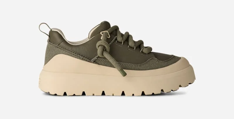 Take on the world in UGG® comfort in our Heritage Utility Sneaker. Channeling old and new, it combines iconic UGG® elements with classic sneaker vibes. The upper features full-grain leather and genuine suede, topped with chunky, round laces. Inside you'll find a soft textile lining and insole from mostly recycled materials, while the lightweight sugarcane EVA outsole features Spider Rubber Pods for enhanced traction, all year long.This product was made in a factory that supports women in our supply chain with the help of Reimagining Industry to Support Equality (RISE). This collaborative initiative creates partnerships with brands like ours to empower and educate women in the workplace. Full-grain leather upper. Suede heel counter, Suede mudguard, Rear pull tab made from 100% recycled polyester fibers. Round Laces. Textile lining (45% recycled polyester, 55% polyester). Textile insole (50% recycled polyester, 50% polyester). Poured PU footbed incorporates at least 50% bio-based content. Spider Rubber Pods for traction, Sugarcane EVA outsole. The UGG® Logo on heel. Additional set of laces included. RN 88276. UGG® Men's Heritage Utility Sneaker Leather Shoes in Moss Green/Buffed, Size 14