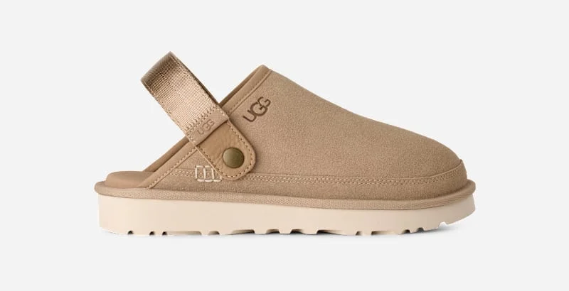 You loved our OG Goldencoast Clog, and you're going to love our Goldencoast Clog II. This version features a smoother footbed and new adjustable back strap that can be slung over the front for even more wearing opportunities. Slip into the lightweight comfort of renewable sugarcane EVA, genuine suede, and a soft microfiber lining from 100% recycled fibers.This product was made in a factory that supports women in our supply chain with the help of Reimagining Industry to Support Equality (RISE). This collaborative initiative creates partnerships with brands like ours to empower and educate women in the workplace. Suede upper. Metal hardware. Adjustable heel strap, Hook-and-loop closure. Textile lining made from 100% recycled polyester fibers, Microfiber binding. Microfiber sockliner. Foam footbed. Sugarcane EVA outsole. The UGG® Logo, heat-embossed. RN 88276. UGG® Men's Goldencoast Clog II Suede Shoes in Sand, Size 12