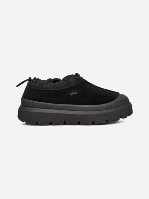 Who (and we can't stress this enough) wants to take a walk in the drizzle with us? We can always count on our Tasman Weather Hybrid to travel with us outdoors, even if its a little wet out there. Featuring waterproof suede and seam-sealed construction as well as our cozy UGG®plush upcycled wool lining, our Tasman Weather Hybrid offers a light, slipper feel with an easy slip-on silhouette. The outsole is made from renewable, rainwater-nourished sugarcane and features a permanent galosh for wet conditions. Waterproof Features. Seam-sealed construction. Waterproof suede. Elastic lace (45% recycled polyester, 55% latex) and toggle. 17mm UGG®plush 60% upcycled wool, 40% TENCEL Lyocell lining. Poured PU footbed incorporates at least 50% bio-based content. Spider Rubber Pods for traction, Sugarcane EVA outsole. The UGG® Logo, heat-embossed. Permanent foam galosh. Best for: Light or moderate rain, Light snow. RN 88276. UGG® Men's Tasman Weather Hybrid Suede Shoes in Mustard Seed/Summer Wheat, Size M 8/W 9