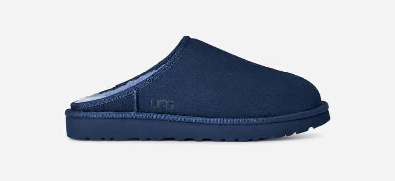 An effortless take on our icon with the same rich suede and soft sheepskin, our new Classic Slip-On offers easy entry and a laidback look. Lined in our signature UGG®plush blend of upcycled wool and plant-based TENCEL Lyocell, it's finished with an ultra-lightweight outsole for grip and cushioning.The outsole of this product is either a sugarcane EVA outsole, which is a responsible compound using sugarcane foam that allows us to reduce dependency on fossil fuels by replacing petroleum-based ethylene, or a Treadlite by UGG® outosle.This product was made in a factory that supports women in our supply chain with the help of Reimagining Industry to Support Equality (RISE). This collaborative initiative creates partnerships with brands like ours to empower and educate women in the workplace. Suede upper. 17mm UGG®plush 60% upcycled wool, 40% TENCEL Lyocell lining. 10mm sheepskin insole. Sugarcane EVA outsole or Treadlite by UGG® EVA outsole. Textile binding made from 100% recycled polyester fibers. The UGG® Logo, heat-embossed. RN 88276. This product contains real fur from sheep or lamb. Fur may be sourced from Australia, Ireland, the United Kingdom, or the United States. It has been artificially dyed and treated.. UGG® Men's Classic Slip-On Sheepskin Slippers in Deep Ocean, Size 6