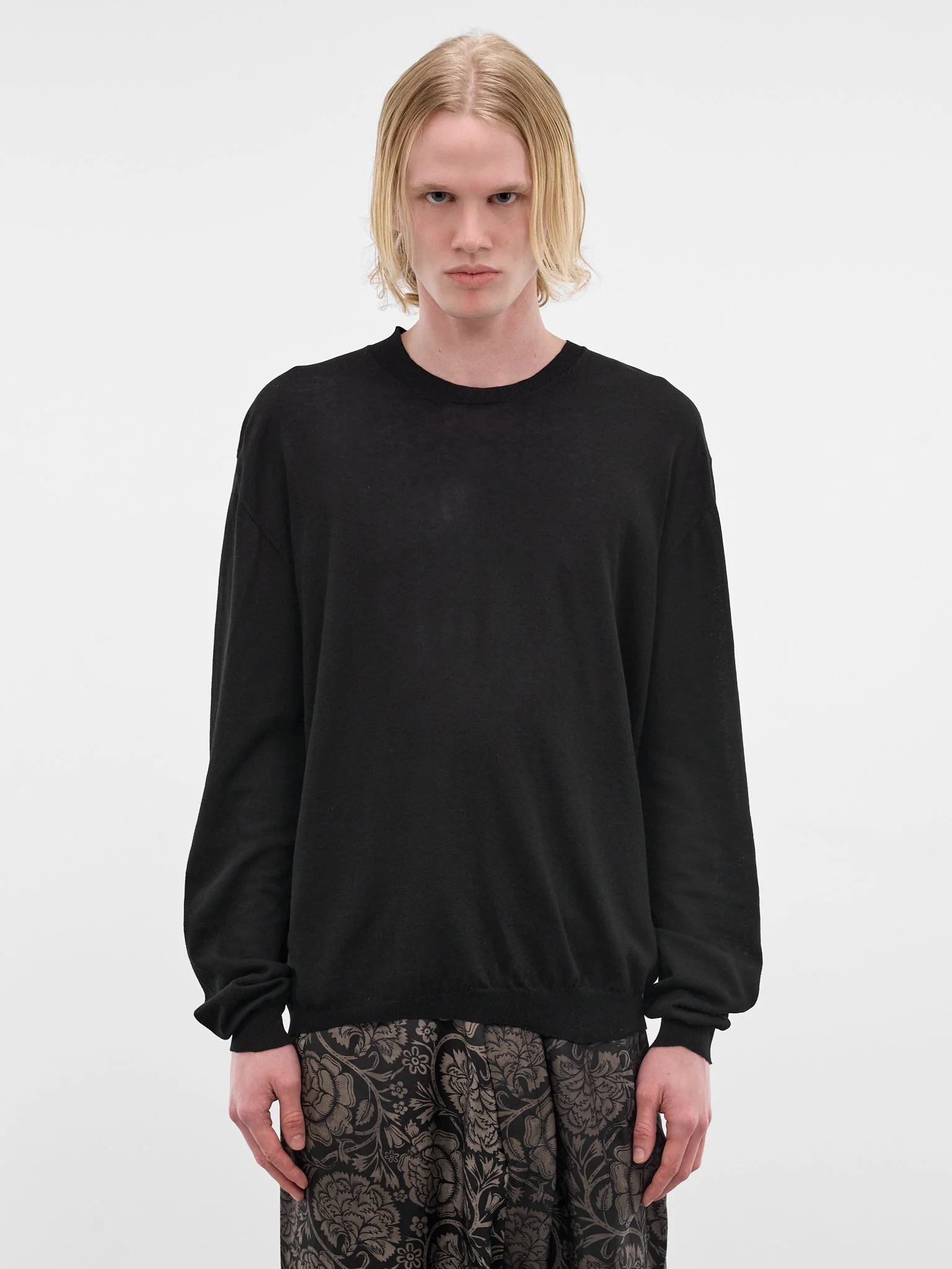 Black t-shirt constructed in a cotton-silk blend with an asymmetric neckline and hem. Featuring: • Relaxed fit • Cotton-silk construction • Asymmetric ribbed crewneck • Dropped shoulders • Long sleeves • Asymmetric hem • 70% Cotton 30% Silk • Standard sizing Model is 6'0" wearing size M. Shoulders: 19" Chest: 35" Waist: 28"