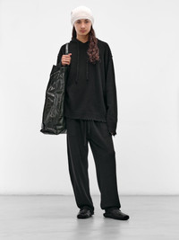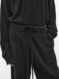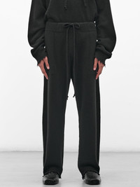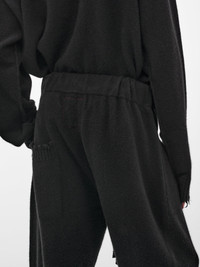 These black trousers are crafted in pure cashmere knit with a tapered, relaxed fit, anchored by an adjustable drawstring waistband and rib-knit hems with subtle distressing. Large three-pocket styling brings a utilitarian touch. Featuring: • Relaxed fit with tapered leg • Cashmere knit construction • Adjustable drawstring waistband • Large three-pocket styling • Rib-knit hems and distressing • Made in Italy • 100% Cashmere • Standard sizing Model is 5'11.5" wearing size M. Shoulders: 18" Chest: 36" Waist: 30"