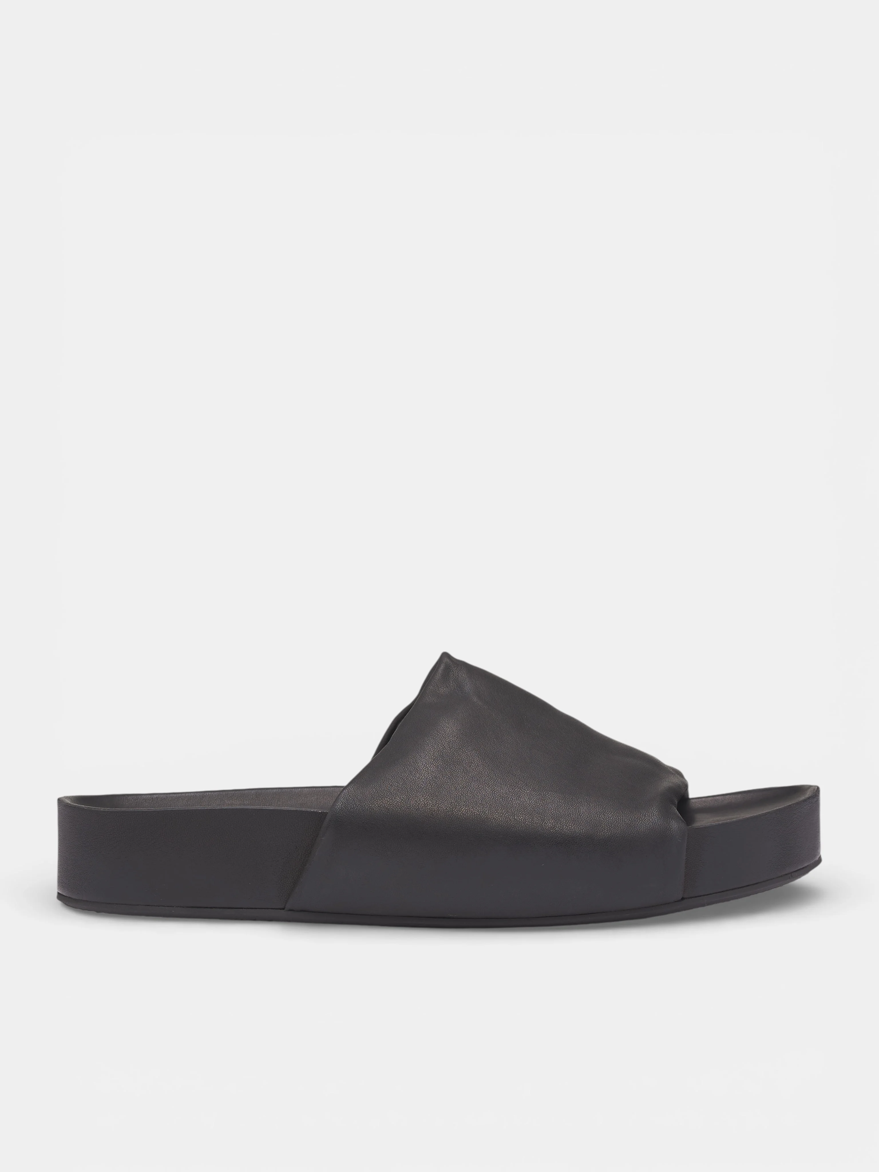 Black sandals constructed in leather with a minimal slide profile and crepe sole. Featuring: • Leather construction • Slide design • Open toe and heel • Vamp strap • Crepe sole • Logo at insole • Upper: 100% Leather | Lining: 100% Leather • Italian sizing