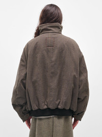 The brown "Jovan Jacket" blouson offers a padded, oversized shape with shearling lining and collar detail. A stand collar, double-breasted button closure, and elasticated hem finish this utilitarian layer. Featuring: • Oversized fit • Padded construction • Shearling lining and collar • Stand collar • Double-breasted front button closure • Dropped shoulders and long sleeves • Side welt pockets • Elasticated hem • Made in Italy • Main: 58% Virgin Wool 42% Cotton | Lining: 60% Acrylic 40% Polyester | Padding: 100% Polyester | Detail: 97% Polyester 3% Elastane • Standard sizing Model is 5'11.5" wearing size M. Shoulders: 18" Chest: 36" Waist: 30"