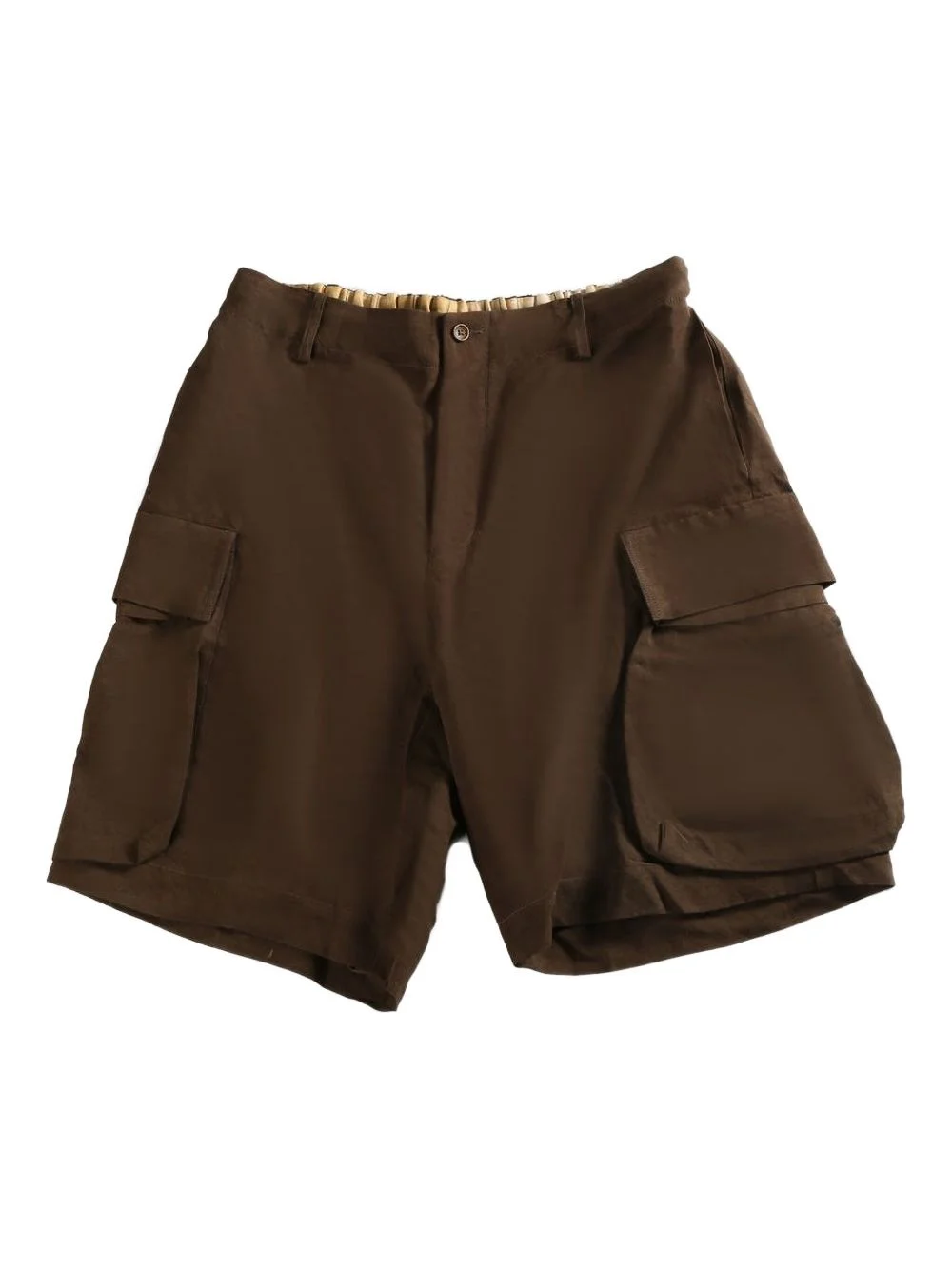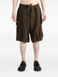 drawstring cargo shorts Highlights - Chocolate brown - Concealed fly and button fastening - Elasticated waistband with internal drawstring - Two side inset pockets - Two side cargo pockets Made in Italy Composition Viscose 51%, Linen/Flax 49%