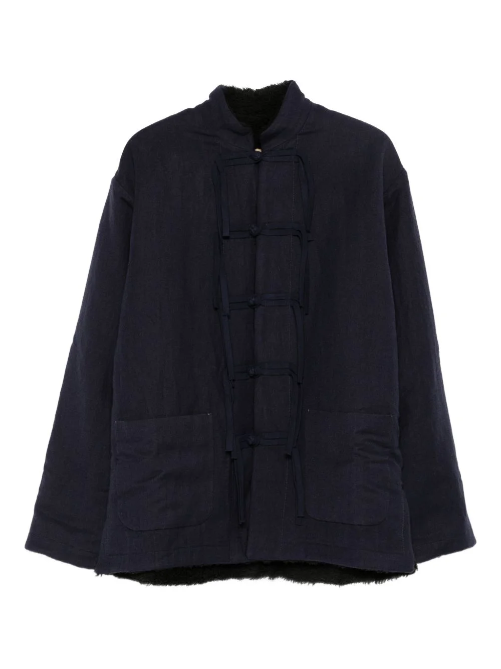 knotted-front jacket Highlights - Dark blue - Knotted-front fastening - Patch pockets - Long sleeves - Mandarin collar Imported Composition Fabric 100% SIZE & FIT Model measurements Height 6 ft 0 in(1.84 m) Bust/Chest 35.82 in(91 cm) Hips 37 in(94 cm) Waist 28.34 in(72 cm) Washing instructions Read Manufacturer Guidelines
