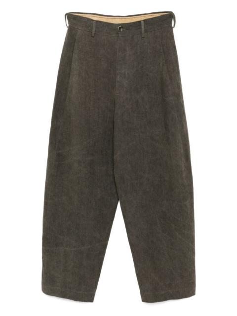 linen trousers Highlights - Smoke grey - Front button and concealed zip fastening - Two side seam pockets - Two rear flap pockets Made in Italy Composition Linen/Flax 100% SIZE & FIT Model measurements Height 6 ft 2 in(1.88 m) Bust/Chest 34.25 in(87 cm) Hips 34.64 in(88 cm) Waist 26.77 in(68 cm) FittingInformation Designed for a relaxed tapered leg, allowing a comfortable loose fit above the knee with a closer fit towards the calves Made from a midweight non-stretch fabric