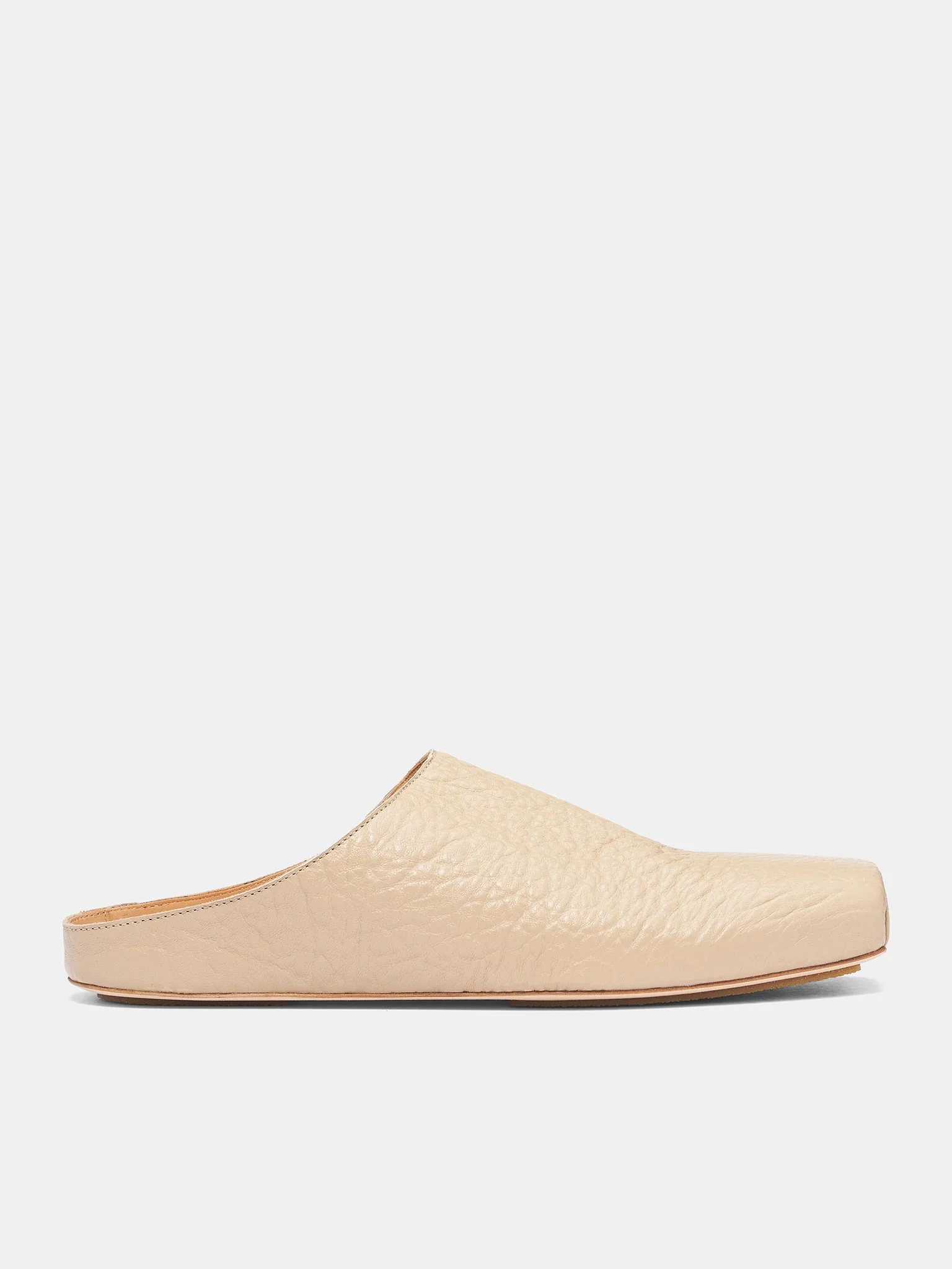 These off-white mule slippers feature a textured grain calf leather and a squared toe for a sculptural, ballet-inspired silhouette. The open heel and crepe sole emphasize laid-back functionality, while a logo-debossed sole and lined interior complete the design. Featuring: • Slip-on fit • Mule slipper design with open heel • Textured grain calf leather construction • Squared toe • Low-top silhouette • Crepe sole • Logo debossed at sole • Lined • Made in Italy • 100% Calf Leather • Italian sizing