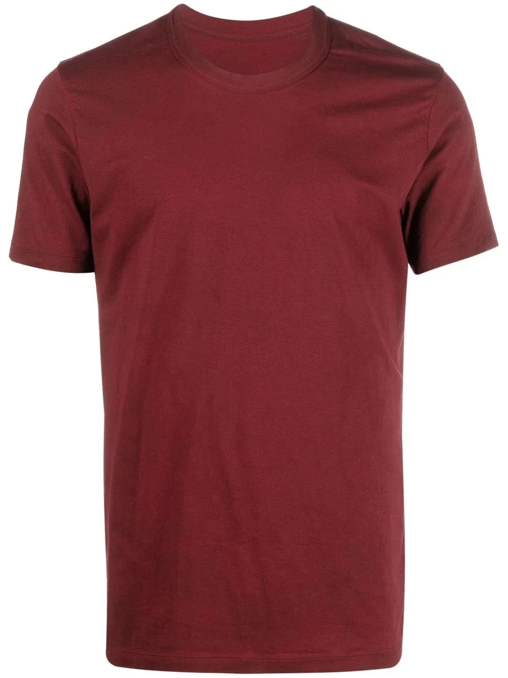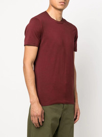 short-sleeved jersey T-shirt dark red stretch-cotton jersey knit crew neck short sleeves straight hem Made in Italy Composition Cotton 90%, Spandex/Elastane 10% SIZE & FIT Model measurements Height 6 ft 2 in(1.89 m) Bust/Chest 36.22 in(92 cm) Hips 37.79 in(96 cm) Waist 29.52 in(75 cm) FittingInformation This piece fits true to size. We recommend you get your regular size Cut for a relaxed fit Made with a mid-weight fabric Washing instructions Hand Wash