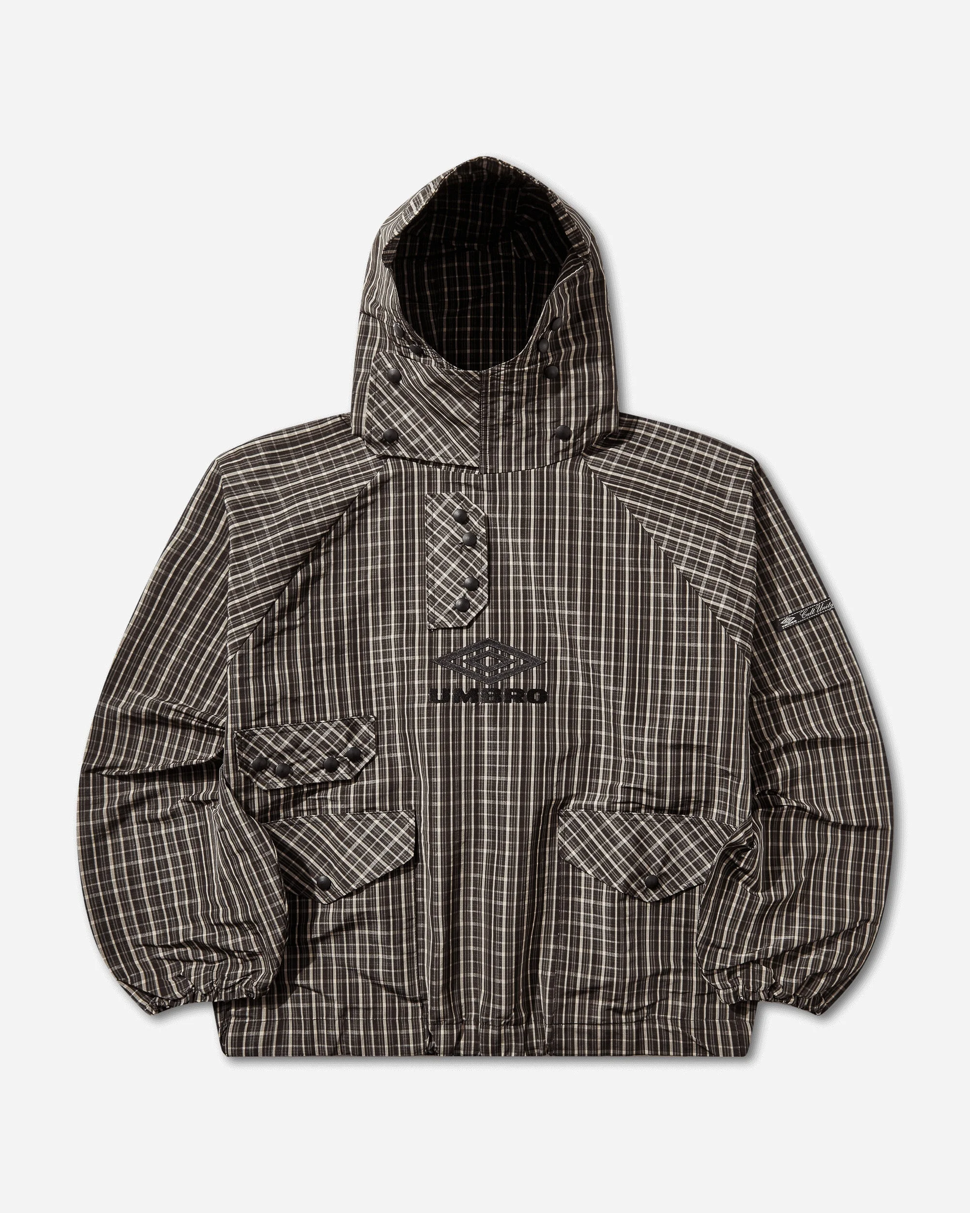Umbro Check Smock Anorak Beige / Dark Brown This collection explores physicality through a shared vocabulary of sport and subculture. Drawing on terms such as defence, offence, volume, and noise, it highlights the parallels between athletic performance and the raw energy of British terrace and sound-driven movements. Rooted in British heritage and uniform, the pieces merge functional influences with the off-pitch attitude. - 100% Polyester - Loose Boxy Fit - Raglan Sleeves - Checkered Pattern - Hood with Snap-Button Closure - Four Front Flap Pockets - Embroidered Branding - Woven Logo Patch - Elasticated Cuffs and Hem - Made in Italy - Style Code: UBMW0470FA300 BEG0015