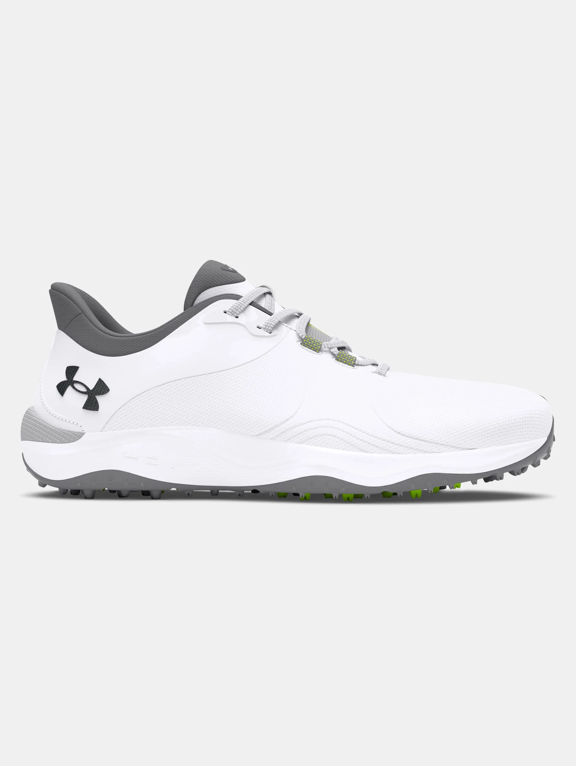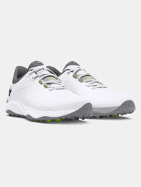 What's it do? The new UA Drive Pro Spikeless golf shoes are biomechanically engineered, and lab tested, to provide the traction, and diagonal and lateral support your feet need to unlock the power of your natural swing. Product DNA - UA Swing Support System (S3) provides smarter traction, dual-foam cushioning & lockdown lacing - Swing Support Strap combines with reinforcement in the upper to provide biomechanically correct lock-in - Energy-returning UA HOVR™ foam + supportive Charged Cushioning® guides natural motion of the foot in a golf swing - Hybrid TPU + rubber outsole for ideal combination of penetrating traction & underfoot comfort - Outsole has strategic flex grooves, directional traction & rubber up the side for added support at impact - Updated fit with more room at the ball of the foot for improved comfort & stability - Breathable, supportive engineered microfiber upper & full waterproof membrane with 1-year warranty - Molded sockliner for enhanced fit & comfort - Regular - Style #: 3026920 - 1 year waterproof warranty - Weight: 12 oz. - Lace type: Standard tie - Imported