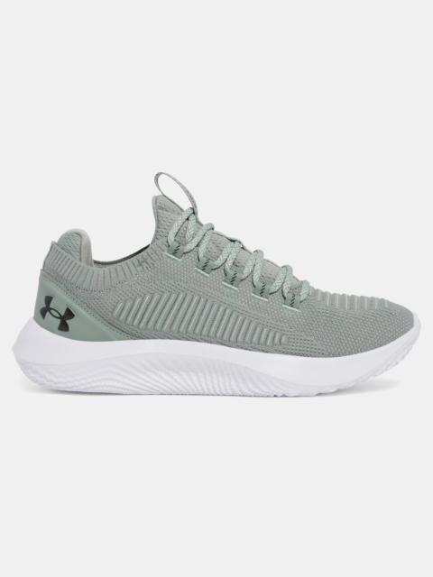 What's it do? UA Dynamic is the ultimate training shoe for the team sports athlete. It combines the bounce and cushioning of a running shoe with the support and grip of a weightlifting shoe, so you can tackle any workout without slowing down. Product DNA - Updated UA IntelliKnit upper combines soft feel & zonal containment where needed - Plush traditional tongue construction for ease of entry - Updated, softer Flow midsole provides responsive cushioning with a wider base for stability during lateral movements - Flow technology eliminates the rubber outsole, creating a more lightweight & seamless ride on any surface - Outsole material is super-durable & increases ground traction - Regular - Style #: 3028076 - Offset: 8mm - Weight: 9.7 oz. - Lace type: Standard tie - Imported