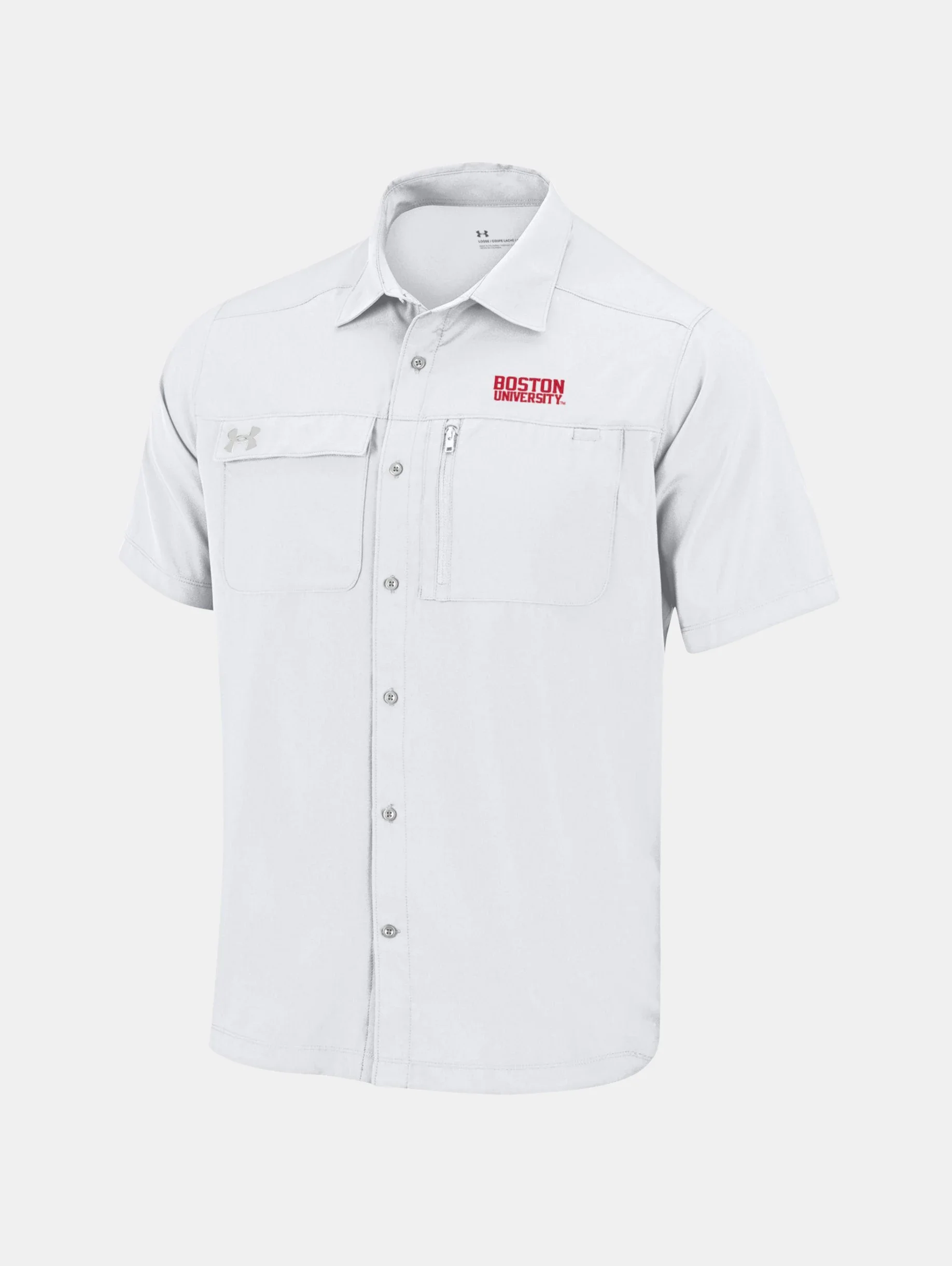 What's it do? Even our fan gear is built for performance—so you can wear it on the field just as easily as you wear it in the stands. The woven material is durable, stain-resistant, and stretchy to move with you. Product DNA - Smooth woven fabric with stain-resistant finish & built-in stretch for greater mobility - UPF 30 protects your skin from the sun's harmful rays - Material wicks sweat & dries really fast - Flap-closure chest pocket & secure, zip chest pocket with utility pocket opening at top - Button-down collar - Shaped hem - Loose: Fuller cut for complete comfort. - Style #: 6010251 - 100% Polyester - Imported