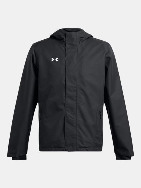 What's it do? Finding the perfect rain shell is tough—there are a million out there. But none quite like this, built for athletes first. It's crazy-light, 100% waterproof, and you won't overheat. Product DNA - UA Storm technology repels water without sacrificing breathability - 2-layer outer fabric with fully taped seams is 100% waterproof & windproof - Interior woven lining for added comfort & warmth - Front hood adjust for optimal fit & protection - Secure, zip hand pockets & left chest pocket big enough for a playbook or tablet - ColdGear® knit cuffs with built-in thumbholes help keep the cold out - Bungee adjust bottom hem for a secure fit - Uses a fluorine-free water repellent treatment - Loose: Fuller cut for complete comfort. - Style #: 1369254 - 10k/10k rating - Body: 100% Polyester - Lining: 100% Nylon - Cuffs: 88% Polyester/12% Elastane - Imported