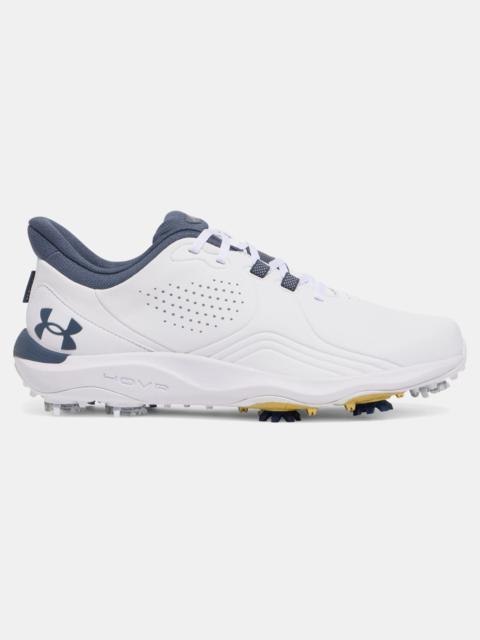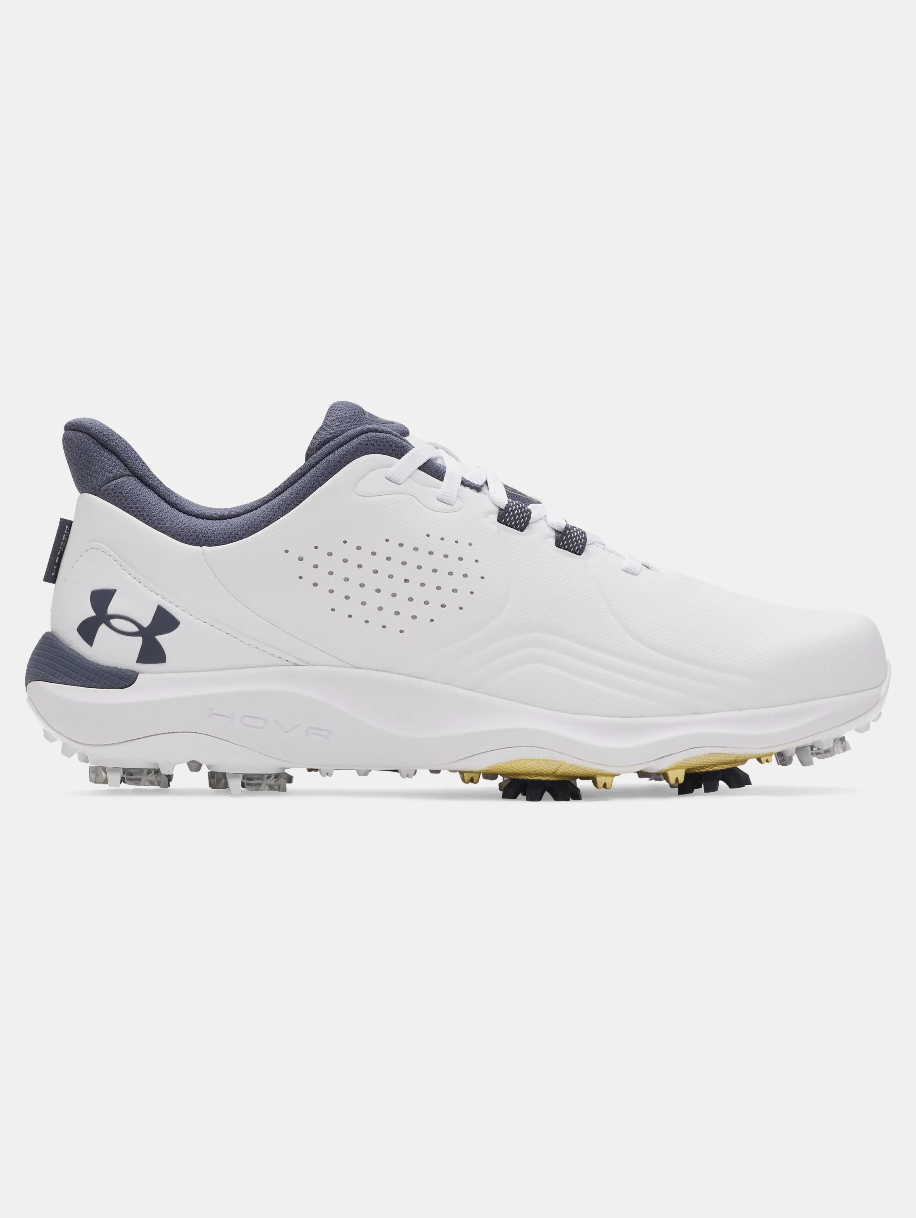 The new UA Drive Pro golf shoes are biomechanically engineered, and lab tested, to provide the traction, and diagonal and lateral support your feet need to unlock the power of your natural swing. Product Details - UA Swing Support System (S3) provides smarter traction, dual-foam cushioning & lockdown lacing - Swing Support Strap combines with reinforcement in the upper to provide biomechanically correct lock-in - Energy-returning UA HOVR™ foam + supportive Charged Cushioning® guides natural motion of the foot in a golf swing - New UA S3 spikes—designed with Softspikes® & a golf biomechanist—for game-changing directional traction - Outsole has strategic flex grooves, secondary traction & TPU up the side for added support at impact - Updated fit with more room at the ball of the foot for improved comfort & stability - Breathable, supportive engineered microfiber upper & full waterproof membrane with 1-year warranty - Molded sockliner for enhanced fit & comfort Size & Fit - Regular Space & Care - Style #: 3026918 - 1 year waterproof warranty - Weight: 12.5 oz. - Lace type: Standard tie - Imported