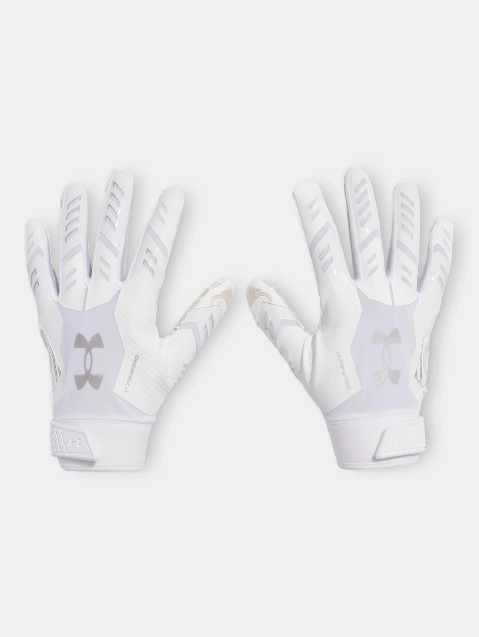 The UA F9 football gloves are light, tight, and sticky—in other words, they're built for nothing but catches. Product Details - Textured TurfGear material on back of hand is ultra-durable & breathable - Silicone print overlays for added support, structure & mobility - UA GlueGrip makes sure your gloves start & stay sticky—providing longer lasting, more consistent tack - Palm wrapover design for enhanced grip & protection on the field - Molded, adjustable closure for a custom, secure fit Size & Fit - Regular Space & Care - Style #: 1381942 - Meets NFHS/NCAA/SFIA standards - 50% Silicone/50% Nylon - Imported