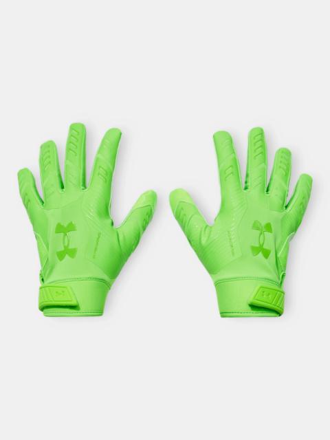 The UA F9 football gloves are light, tight, and sticky—in other words, they're built for nothing but catches. Product Details - Textured TurfGear material on back of hand is ultra-durable & breathable - Silicone print overlays for added support, structure & mobility - UA GlueGrip makes sure your gloves start & stay sticky—providing longer lasting, more consistent tack - Palm wrapover design for enhanced grip & protection on the field - Molded, adjustable closure for a custom, secure fit Size & Fit - Regular Space & Care - Style #: 1381942 - Meets NFHS/NCAA/SFIA standards - 50% Silicone/50% Nylon - Imported