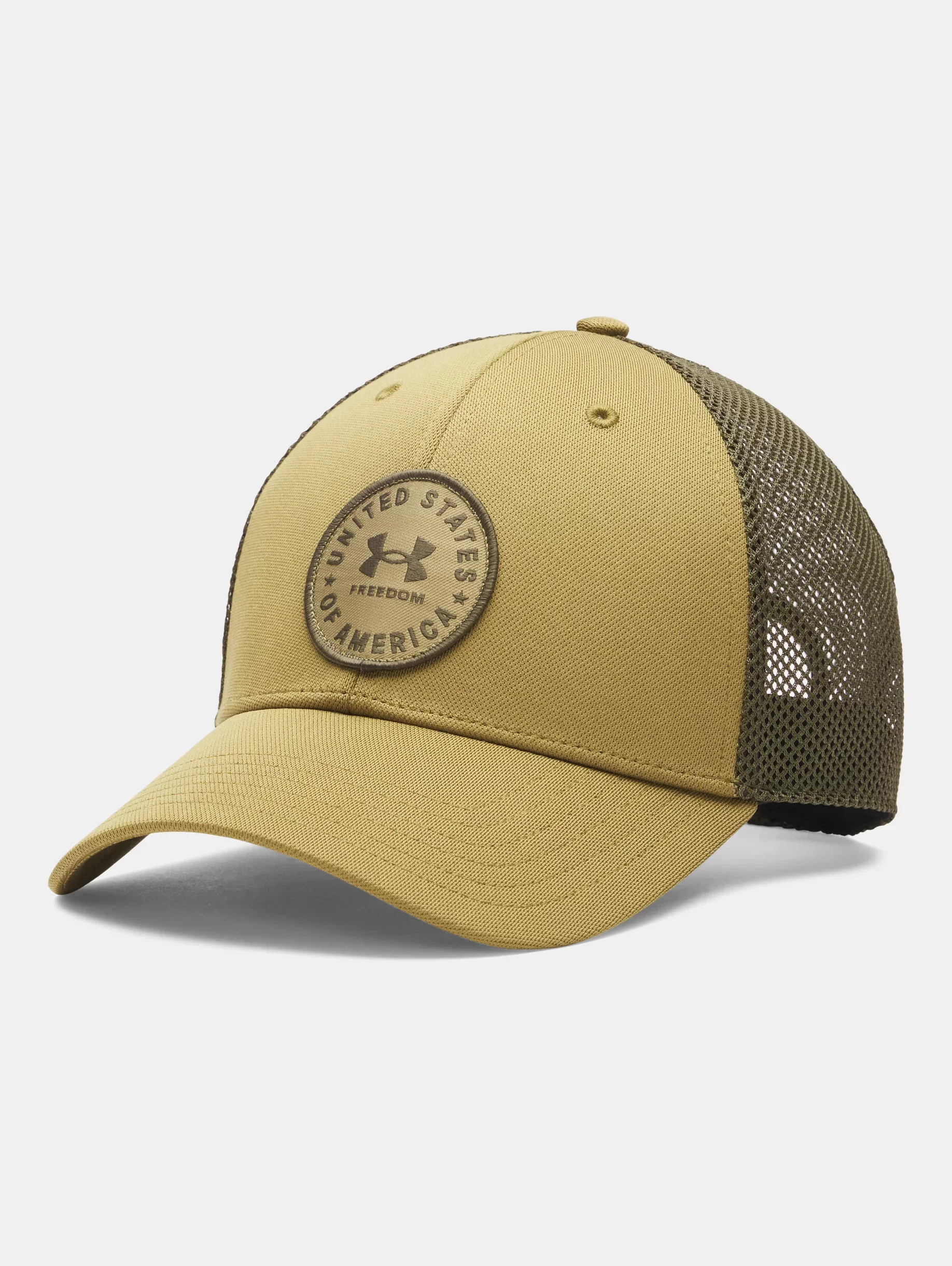 UA Freedom's goal is to support and inspire the brave men and women dedicated to protecting us, every day. This trucker hat is breathable, comfortable, and keeps the sun off your face. Product Details - UA Mid: Modern square mid-crown with structured front panel—sits slightly higher, just off the head - Textured knit fabric is super-soft for all day comfort - Trucker mesh side & back panels deliver added ventilation - Adjustable snapback closure - Odor control technology minimizes odor - Main body fabric contains at least 90% recycled polyester, excluding trims & embellishments Size & Fit - Adjustable Space & Care - Style #: 6003571 - Front patch logo - 100% Polyester - Imported