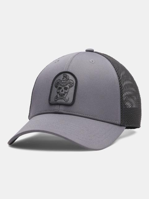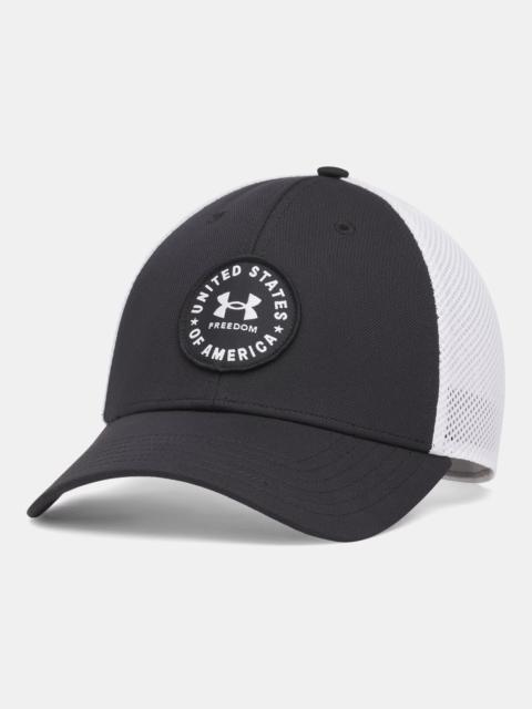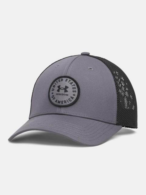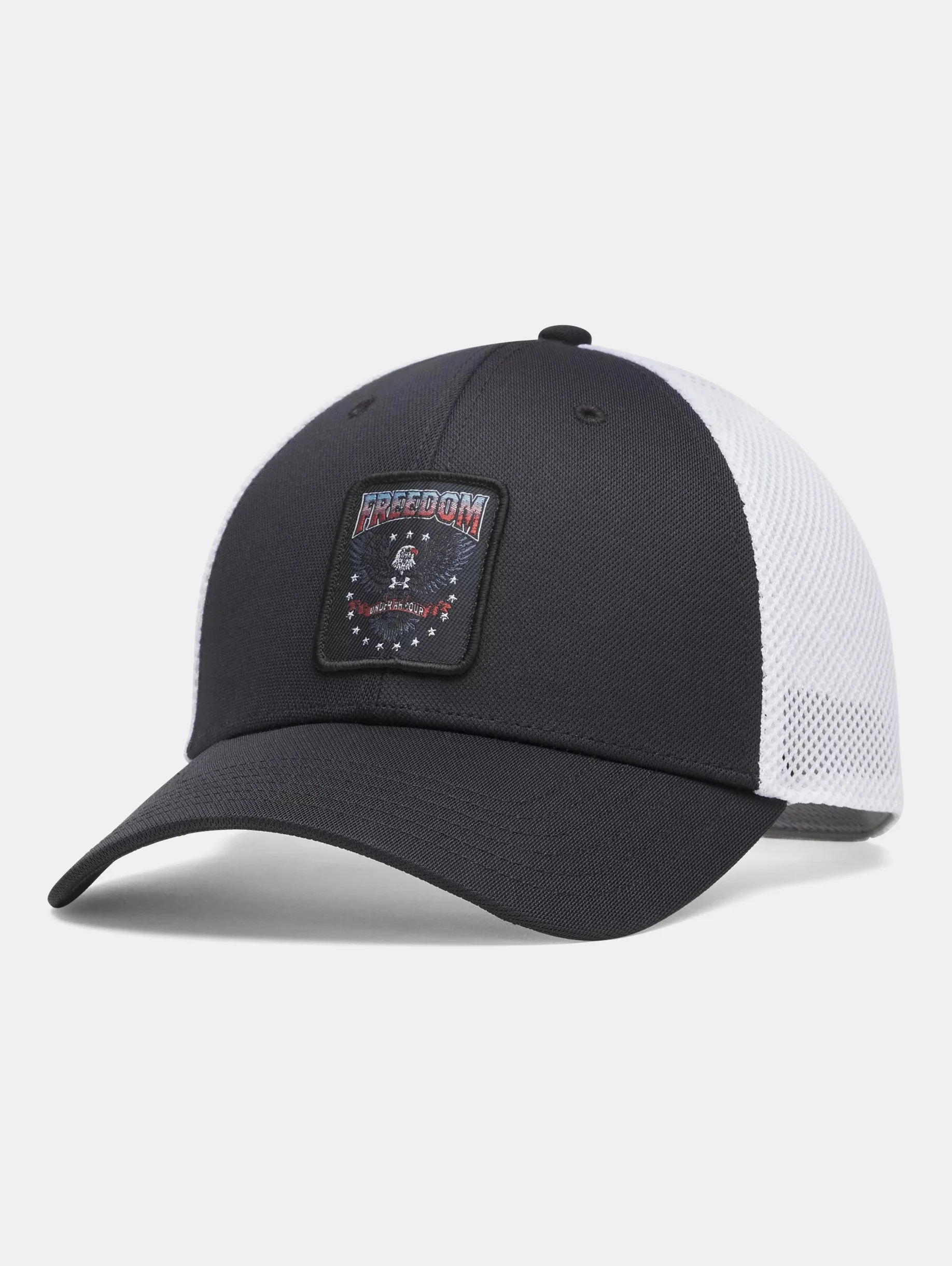 UA Freedom's goal is to support and inspire the brave men and women dedicated to protecting us, every day. This trucker hat is breathable, comfortable, and keeps the sun off your face. Product Details - UA Mid: Modern square mid-crown with structured front panel—sits slightly higher, just off the head - Textured knit fabric is super-soft for all day comfort - Trucker mesh side & back panels deliver added ventilation - Adjustable snapback closure Size & Fit - Adjustable Space & Care - Style #: 6003571 - Front patch logo - 100% Polyester - Imported