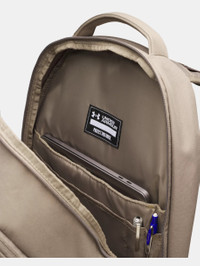 The backpack for whatever you want to throw at it—all the pockets you need, in a comfortable feel and carrying options that make this the first thing you grab on your way out. Product Details - Water-resistant UA Storm technology keeps your essentials dry - LEVELED™ strap system guides you to assure straps are adjusted evenly for balanced weight distribution - Soft-to-the-touch top coat on material for added durability - Soft-lined laptop sleeve—holds up to 16" MacBook Pro® or similarly sized laptop - Secondary compartment can be dual-purposed as a shoe/laundry pocket - Secure zip front pockets for essential item storage & side water bottle pocket that fits 32oz bottle - Adjustable, removable UA Strap Clip™ on shoulder to prevent duffle bag from falling off when carrying both - Strap clip works best when sternum clip is fastened Size & Fit - One Size Fits Most Space & Care - Style #: 1384671 - Molle webbing for additional attachment points - Dimensions When Full: 6.3"W x 20.1"H x 12.6"L - Volume: 31 L - 88% Polyester/12% Polyurethane - Imported