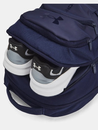 What's it do? The backpack for whatever you want to throw at it—all the pockets you need, in a comfortable feel and carrying options that make this the first thing you grab on your way out. Product DNA - Water-resistant UA Storm technology keeps your essentials dry - LEVELED™ strap system guides you to assure straps are adjusted evenly for balanced weight distribution - Soft-to-the-touch top coat on material for added durability - Soft-lined laptop sleeve—holds up to 16" MacBook Pro® or similarly sized laptop - Secondary compartment can be dual-purposed as a shoe/laundry pocket - Secure zip front pockets for essential item storage & side water bottle pocket that fits 32oz bottle - Adjustable, removable UA Strap Clip™ on shoulder to prevent duffle bag from falling off when carrying both - Strap clip works best when sternum clip is fastened - One Size Fits Most - Style #: 1384671 - Molle webbing for additional attachment points - Dimensions When Full: 6.3"W x 20.1"H x 12.6"L - Volume: 31 L - 88% Polyester/12% Polyurethane - Imported