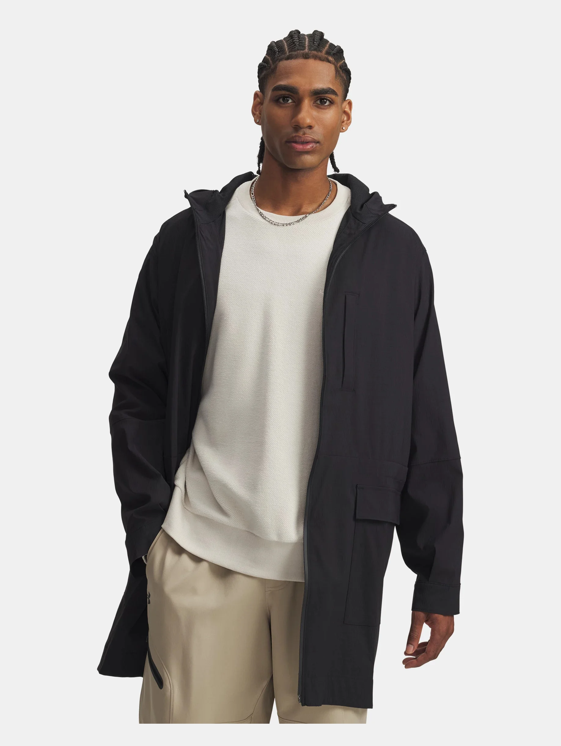 Always on point—this extra-long jacket is made with textured woven fabric that repels water, stretches when you need it, and is insanely durable. So, when you step out on the street, you can do it confidently. Product Details - UA Storm technology repels water without sacrificing breathability - Textured ripstop woven fabric is lightweight & extremely durable - 4-way stretch material moves better in every direction - Flap closure hand pockets & secure zip chest pocket - Adjustable cuffs - Extended body length for added coverage with shaped hem & back vent construction Size & Fit - Fuller cut for complete comfort. Space & Care - Style #: 6008870 - 93% Nylon/7% Elastane - Imported