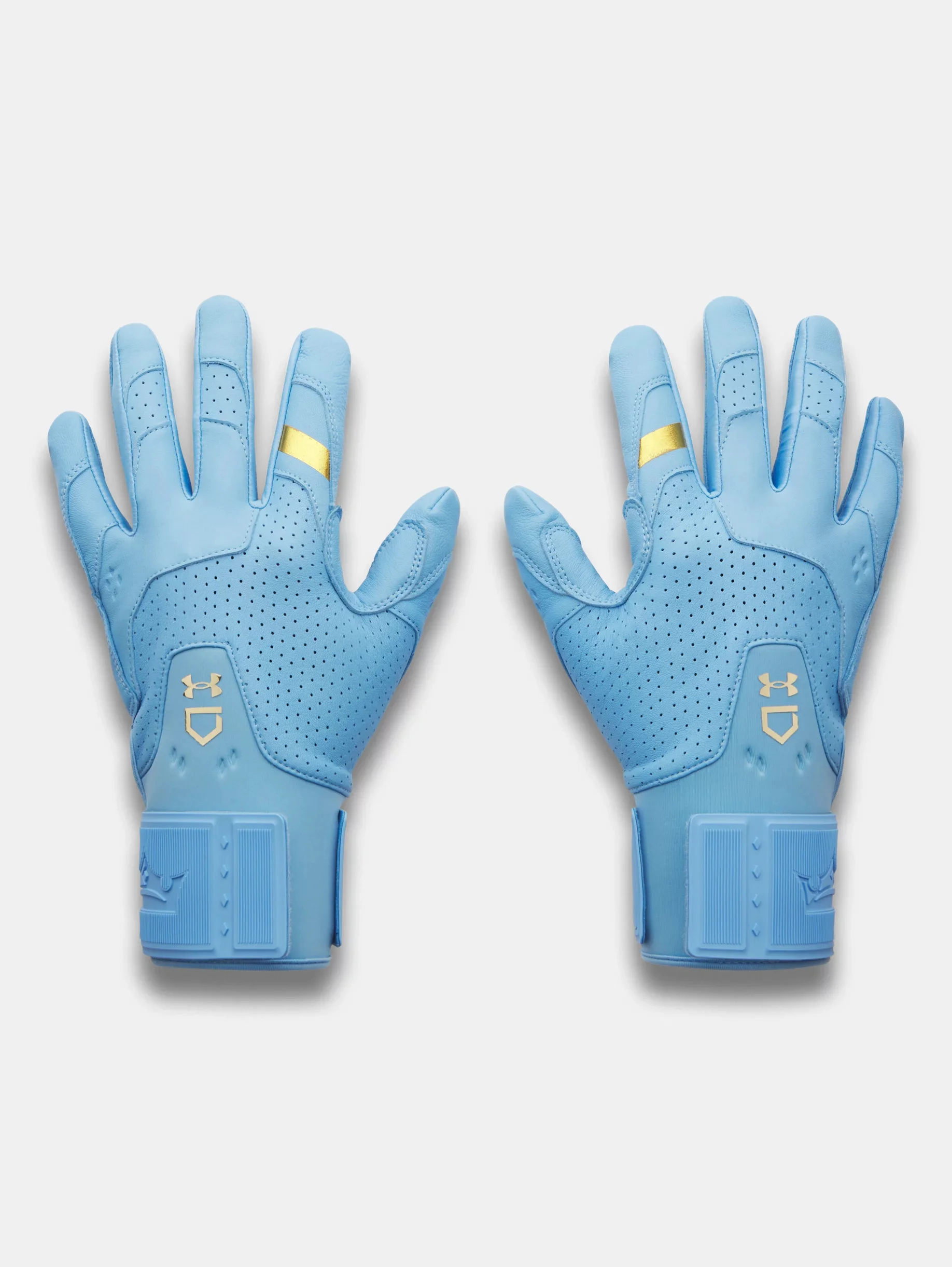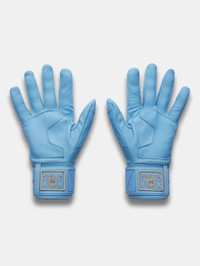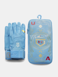 Play like a king and rule the diamond with these batting gloves.Built with premium materials that are ultra-comfortable and give you better control. Plus, top-of-the-line wrist support and even a carry bag for easy storage. Product Details - Full leather back of hand combines smooth & perforated sheepskin for amazing feel & function on the field - Premium sheepskin leather palm provides a supple hand feel for better bat control - Strategically-placed reinforced leather patches for added durability - Thick, 360° molded adjustable cuff strap for best-in-class wrist support - Includes carry bag with durable rubber finish, zip closure, fence hook & lockertag to write your name/number Size & Fit - Adjustable Space & Care - Style #: 1389033 - Gold foil screen-printed details & metallic embroidered patch logo - Sold in pairs - 60% Sheep Leather/11% Goat Leather/11% Nylon/11% Polyester/4% Rubber/3% Elastane - Imported