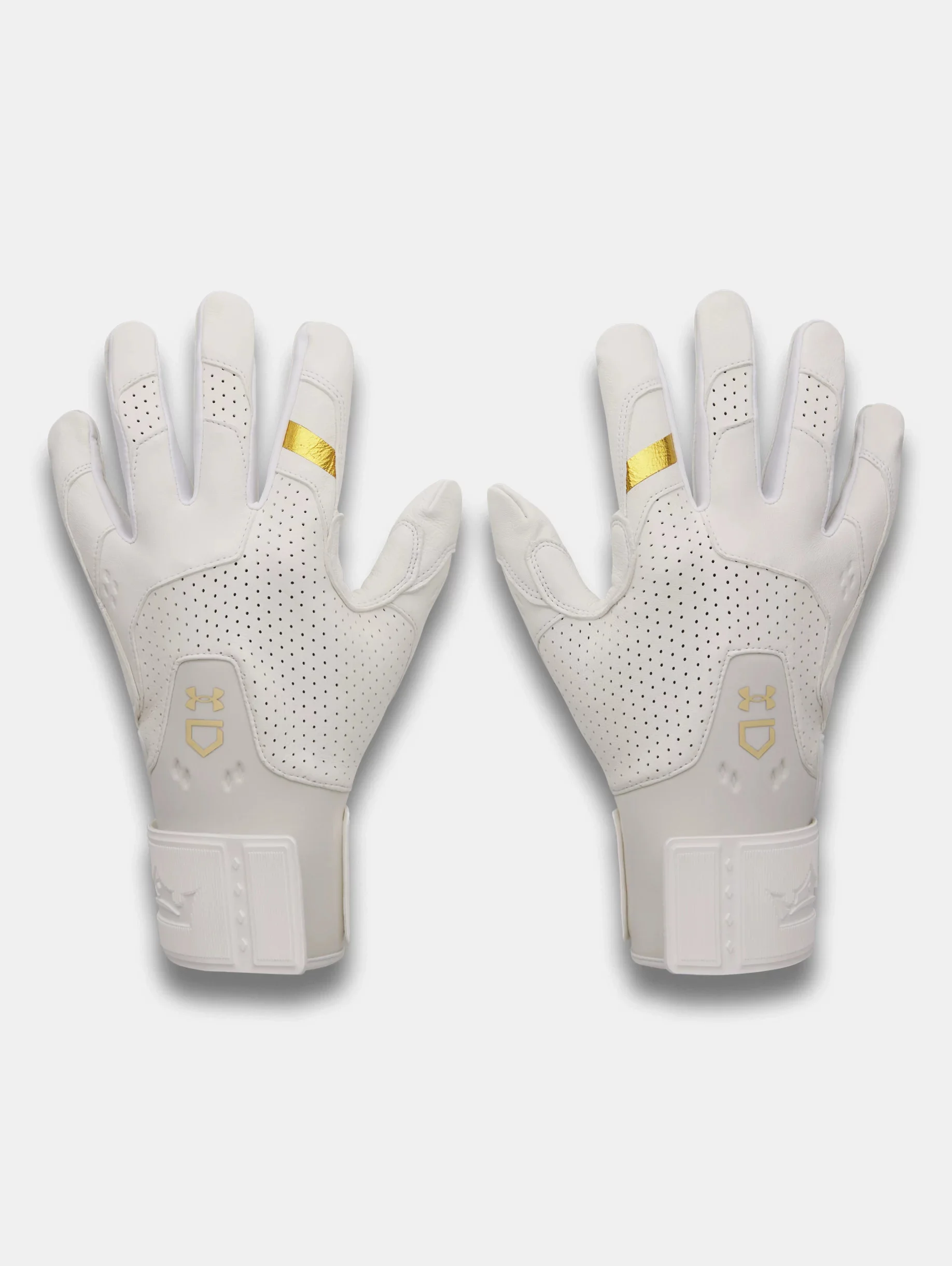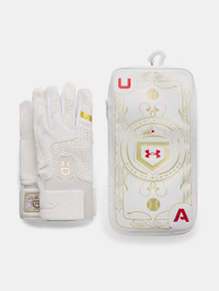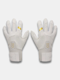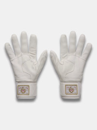 Play like a king and rule the diamond with these batting gloves.Built with premium materials that are ultra-comfortable and give you better control. Plus, top-of-the-line wrist support and even a carry bag for easy storage. Product Details - Full leather back of hand combines smooth & perforated sheepskin for amazing feel & function on the field - Premium sheepskin leather palm provides a supple hand feel for better bat control - Strategically-placed reinforced leather patches for added durability - Thick, 360° molded adjustable cuff strap for best-in-class wrist support - Includes carry bag with durable rubber finish, zip closure, fence hook & lockertag to write your name/number Size & Fit - Adjustable Space & Care - Style #: 1389033 - Gold foil screen-printed details & metallic embroidered patch logo - Sold in pairs - 60% Sheep Leather/11% Goat Leather/11% Nylon/11% Polyester/4% Rubber/3% Elastane - Imported