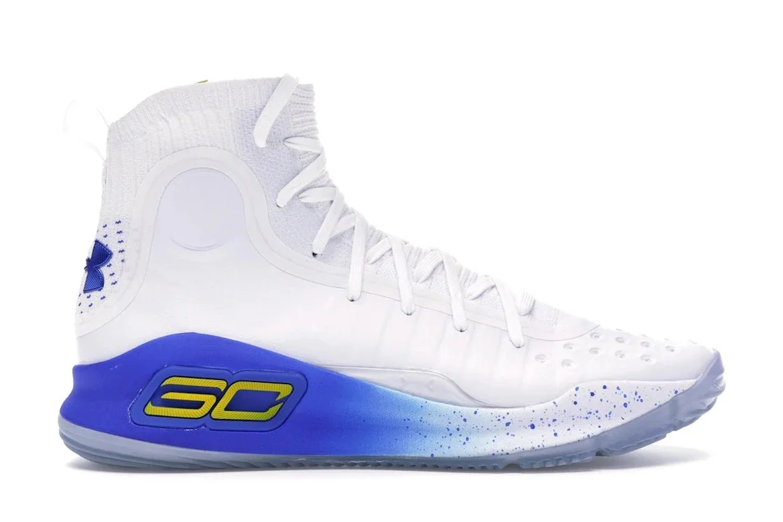 The Under Armour Curry 4 Home is a basketball shoe designed with dynamic direction changes and flexibility in mind. This Under Armour Curry 4 version features a lightweight knit upper in white with perforations on the rounded toe box for breathability. The white fabric around the ankle allows for a comfortable sock-like fit. TPU panels add extra support to the shoe's build. The white textile around the heel is decorated with Royal Blue specks and an embroidered Royal Blue Under Armour logo. A strip of yellow going up the inner ankle adds another pop of color to the otherwise white shoe. The durable rubber sole sports an ombre effect, going from white with blue specks at the toe to full blue at the heel. What we like most about this shoe is the EVA foam midsole. This adds comfort and performance enhancement to an already stylish and clean-looking shoe. The Under Armour Curry 4 Home was first released on December 16, 2017, for a retail price of $130. - Style 1298306-100 - Colorway White/Yellow-Royal Blue - Retail Price 130 - Release Date 2017-12-16 - Featured false - Product Line Under Armour Curry