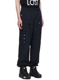 Crinkled nylon taffeta cargo pants. · Concealed drawstring at elasticized waistband · Four-pocket styling · Zip-fly · Patch and zip pockets at front · Bungee-style drawstring at cuffs · Patch pocket at outseam · Transparent PVC patch pocket at back · Logo printed at back · Full mesh lining Supplier color: Black Body: 100% nylon. Lining: 100% polyester. Made in Japan 241414M188000