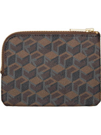 Grained faux-leather pouch. · Graphic text pattern throughout · Logo stamp at face · Zip closure · Buffed faux-leather lining · Gold-tone hardware · H4" x W5" Supplier color: Brown Synthetic. Made in Japan 261414M164000