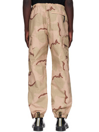 Undercover joggers in beige, elasticized waistband, slash hand pockets, zipped back pocket, straight leg silhouette, all over camo print. Made in Japan Japanese Sizing. Composition: 100% Nylon. Model is 6'2" and wearing a size 3. Shoulders: 17" Chest: 33" Waist: 27"
