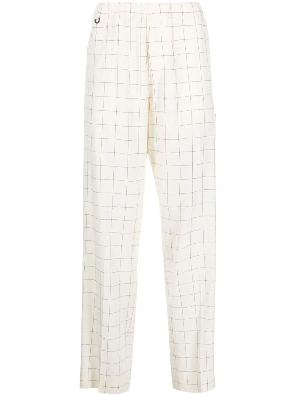 windowpane-print wide-leg trousers Highlights - Ivory white/light grey - Windowpane print - Patch detail - Elasticated waistband - Two side inset pockets - Rear welt pocket - Rear flap pocket - Wide leg Imported Composition Rayon 48%, Acetate 41%, Silk 11% SIZE & FIT Model measurements Height 6 ft 2 in(1.88 m) Bust/Chest 35.03 in(89 cm) Hips 35.82 in(91 cm) Waist 27.95 in(71 cm) FittingInformation Designed for a straight-leg, allowing for an unrestricted and comfortable fit over the leg Made from a midweight non-stretch fabric, this piece offers minimal elasticity when worn This piece fits true to size – take your usual size Washing instructions Dry Clean Only