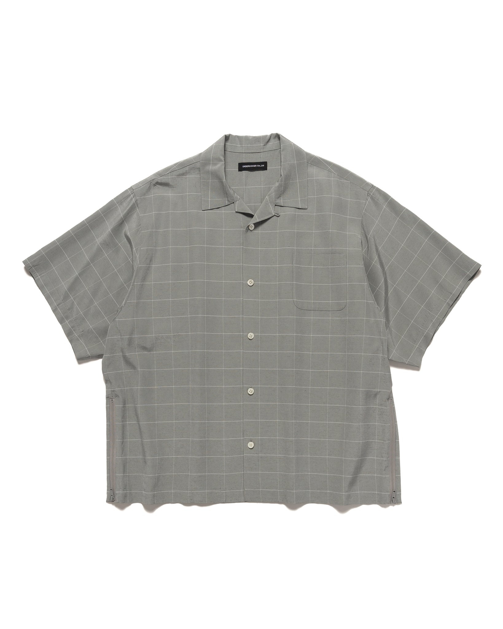 A breezy open collar shirt crafted from a textural rayon, acetate and silk blend check fabric. Features a window pane check pattern, half length sleeves and a zippered side split hem. Finished with a patch chest pocket and button placket. DETAILS - UC1C4402-2 - 45% rayon, 44% acetate and 11% silk - Relaxed fit - Open collar - Half length sleeve - Patch chest pocket - Zip closure side split hem - Button closure
