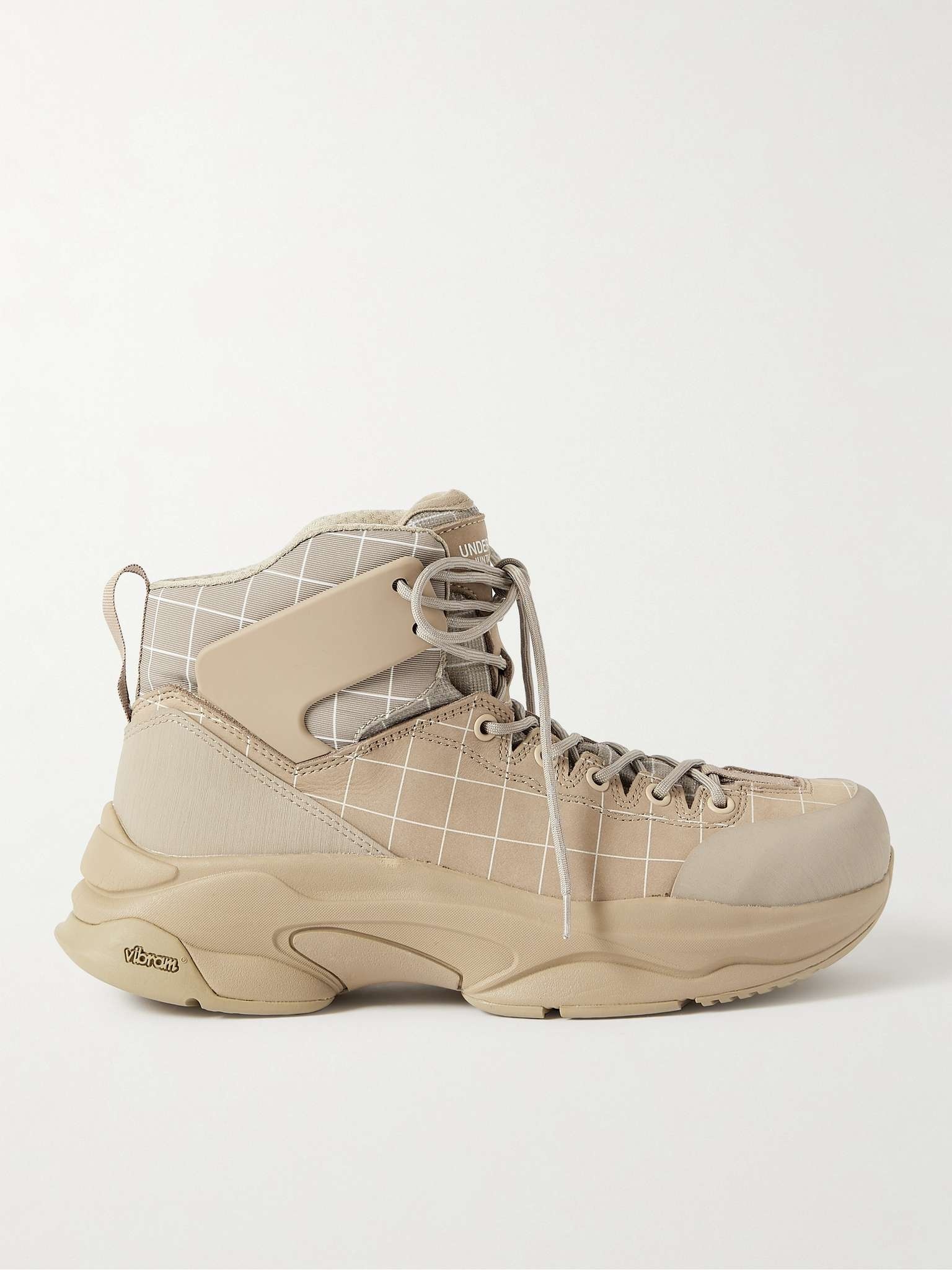 - Beige and white nubuck (Cow) and canvas - Pull tabs, padded collars, designer emblems, rubber trims, Vibram soles - Lace-up