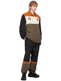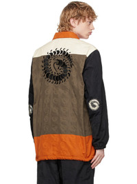 Long sleeve woven jacket colorblocked in black, white, orange, and beige featuring tonal pattern embossed throughout. Graphic embroidered in black and white throughout. Spread collar. Press-stud closure at front. Concealed drawstring at hem. Elasticized cuffs. Welt pocket at interior. Fleece lining in black. Tonal hardware. Supplier color: Beige base Body: 100% polyester. Lining: 100% polyester.