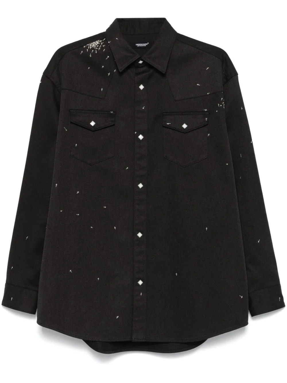 cross-motifs shirt Highlights - Black - Twill weave - Cross motifs - Front press-stud fastening - Spread collar - Two chest flap pockets - Long sleeves - Press-stud fastening cuffs - Curved hem Imported Composition Polyester 60%, Cotton 40% SIZE & FIT Model measurements Height 6 ft 2 in(1.89 m) Bust/Chest 39.76 in(101 cm) Hips 37.4 in(95 cm) Waist 29.92 in(76 cm) FittingInformation Designed to be unstructured, offering a loose fit throughout Made from a midweight non-stretch fabric Washing instructions Hand Wash