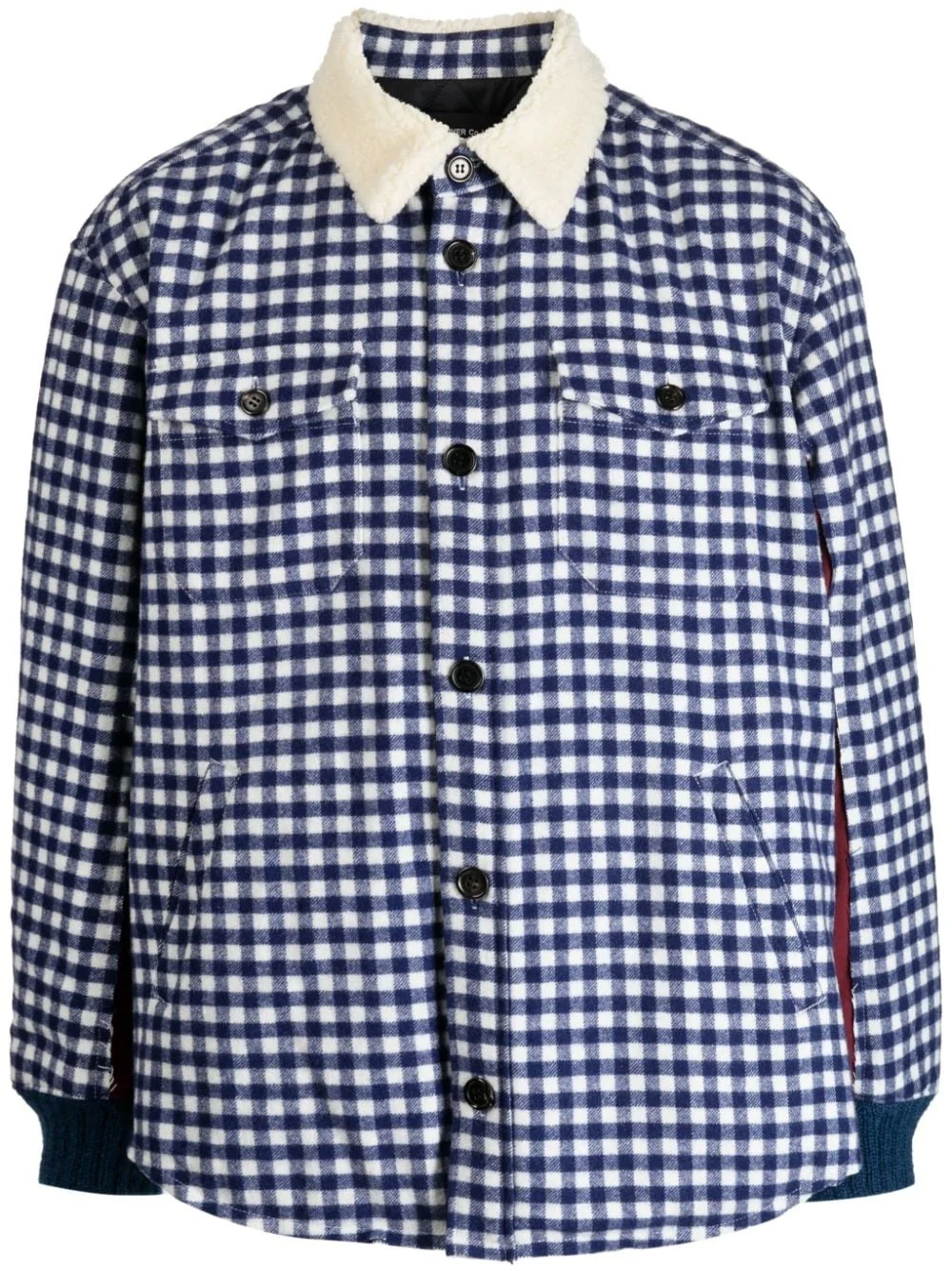 gingham-check flannel shirt jacket Highlights - Navy blue/white/burgundy - Wool blend/cotton/mohair-wool blend - Flannel - Gingham check pattern - Faux-shearling collar - Front button fastening - Long sleeves - Ribbed cuffs - Two chest flap pockets - Two front welt pockets - Raw-cut hem - Quilted lining Imported Composition Outer: Wool 70%, Nylon 30% Lining: Cupro 100% Filling: Polyester 100% Trims: Cotton 100% Mohair 55%, Nylon 30%, Wool 15% SIZE & FIT Model measurements Height 6 ft 2 in(1.87 m) Bust/Chest 33.07 in(84 cm) Hips 35.43 in(90 cm) Waist 26.77 in(68 cm) FittingInformation Designed for a boxy fit, intended for a loose fit throughout Made from a padded non-stretch fabric, giving it no natural elasticity This piece fits true to size – take your usual size